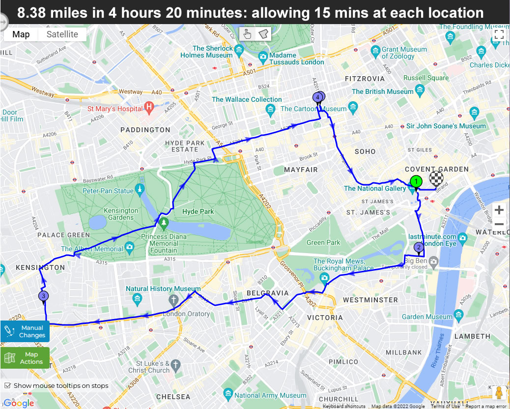 | 1 | Trafalgar Square | London | WC2N 5DN | 12:00 | 20 mins | 12:20 |